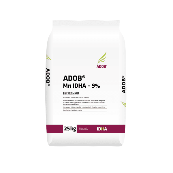 Το ADOB Mn IDHA – 9% είναι ένα εξειδικευμένο λίπασμα ειδικά σχεδιασμένο για να προμηθεύει φυτά με εξαιρετικά διαθέσιμα κατιόντα μαγγανίου.
